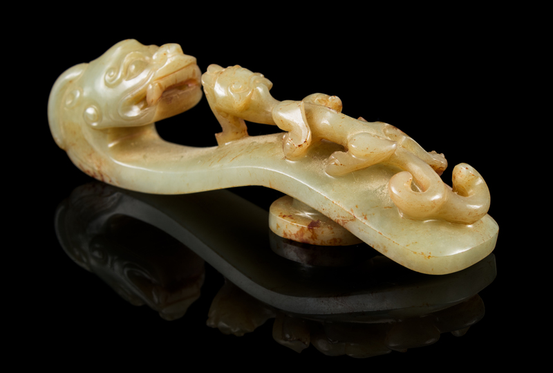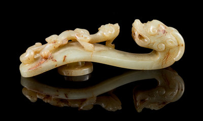 A Carved Celadon and Russet Jade Belt Hook