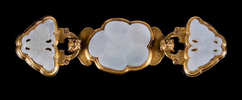 the gilt mounting in three sections, the larger section inset with a jade plaque in the form of a blooming flower, flanked by a pair of dragon head-form hooks, two small sections each inset with a bufferfly-form jade plaque surmounted by a loop, the reverse with a stap-like loop.