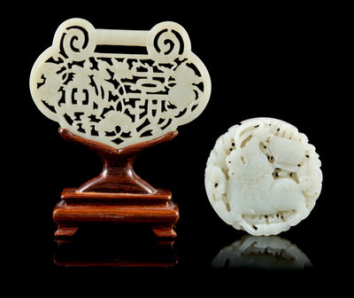 the first of circular form, carved to the front with a standing fu lion with the mouth wide open, the reverse with four characters enclosed in a square panel surrounded by four winged bats; the second of ruyi- form, carved to depict a fu and a shou characters surrounded by peaches, a bat and a hanging chime, raised on a hardwood stand.