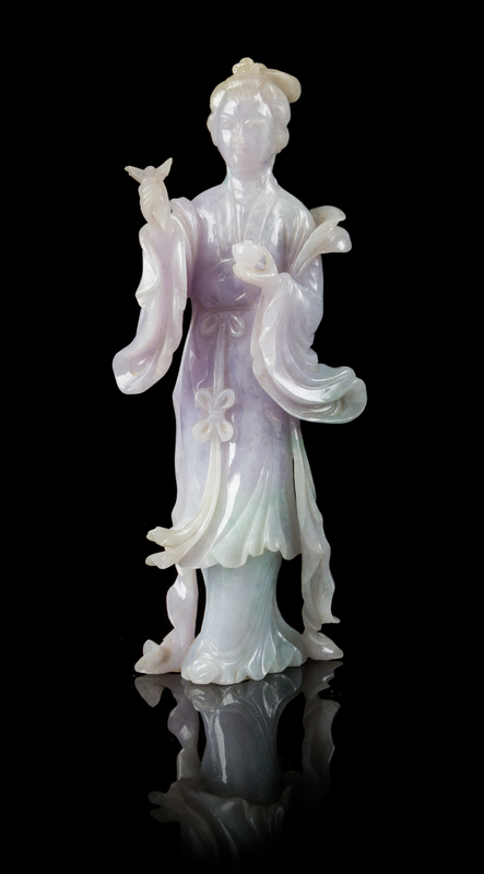 the figure depicted standing wearing layered robes, the left hand holding a vase, her face carved with a calm expression.