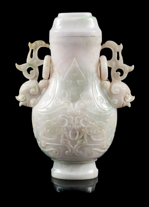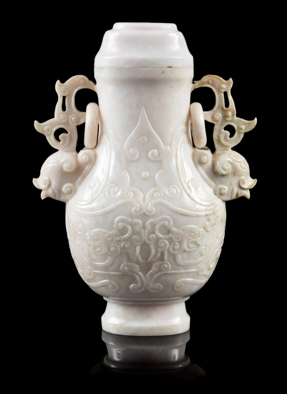 the pear shaped body carved on both sides each with a pair of confronting chilongs, the recessed neck carved with two phoenix-form handles suspending loose rings, raised on a fitted hardwood stand.
