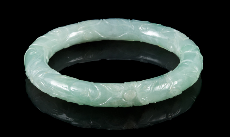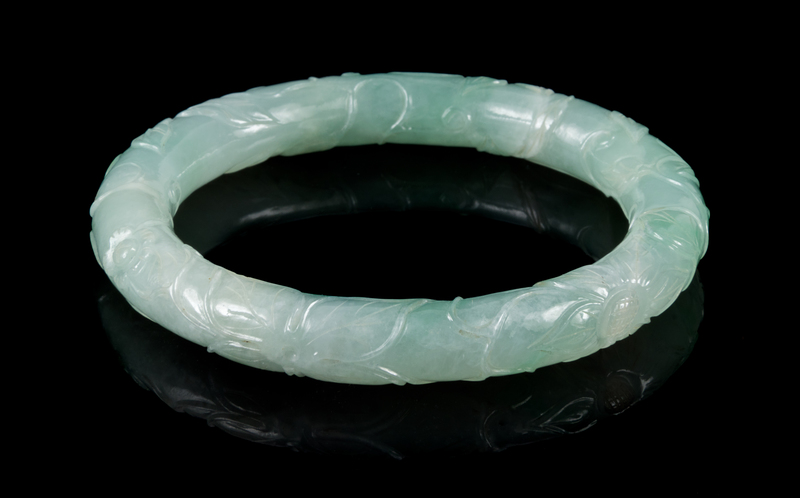 of cylindrical form, carved with floral sprigs, the celadon stone with white inclusions.
