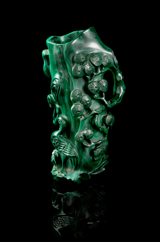 in the form of a tree trunk, carved in high relief with gnarled branches, depicting a bird perched on branches and another rest atop rockworkswith a lingzhi sprig.
