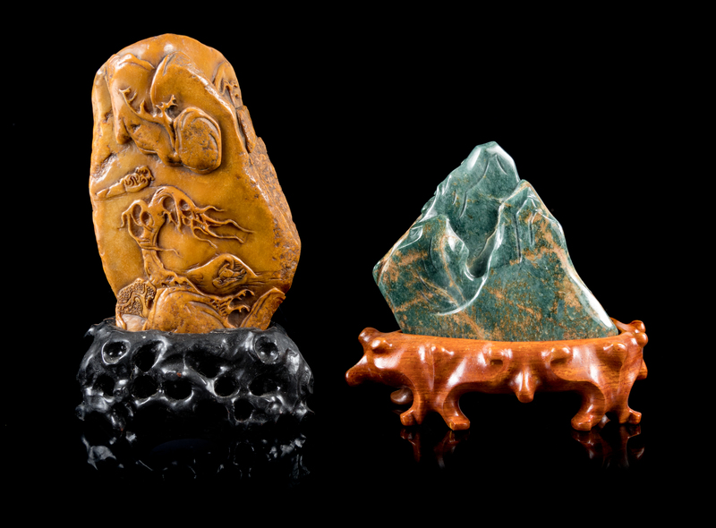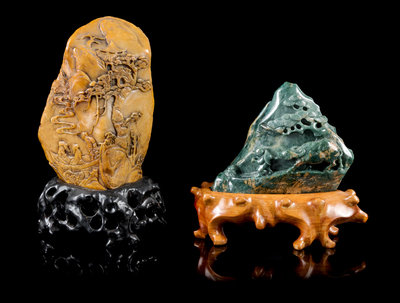 the first a yellow toned stone carved in relief with a continuous mountainous landscape showing scholars on a boat underneath pine tree, raised on a later stand; the second a blue stone carved to depict a farmer underneath pine trees, raised on a later stand.