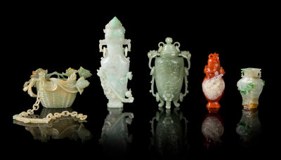 comprising a flattened jadeite baluster vase carved with chilong and cover; a high shouldered celadon jade vase on three legs carved with floral motifs and cover; a jadeite vase carved as a flower basket with lotus and chain handle; a jadeite trapezoidal-section baluster vase carved with chilong; and a red and white quartz vase, also carved with chilong and cover.