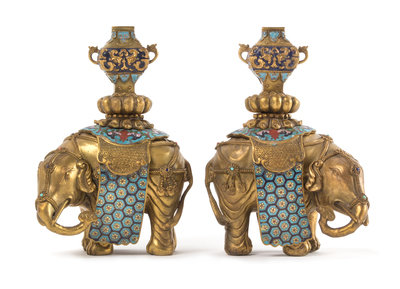 A Pair of Cloisonne Enamel and Gilt Bronze Models of Elephants