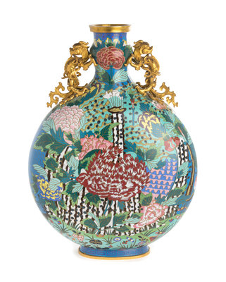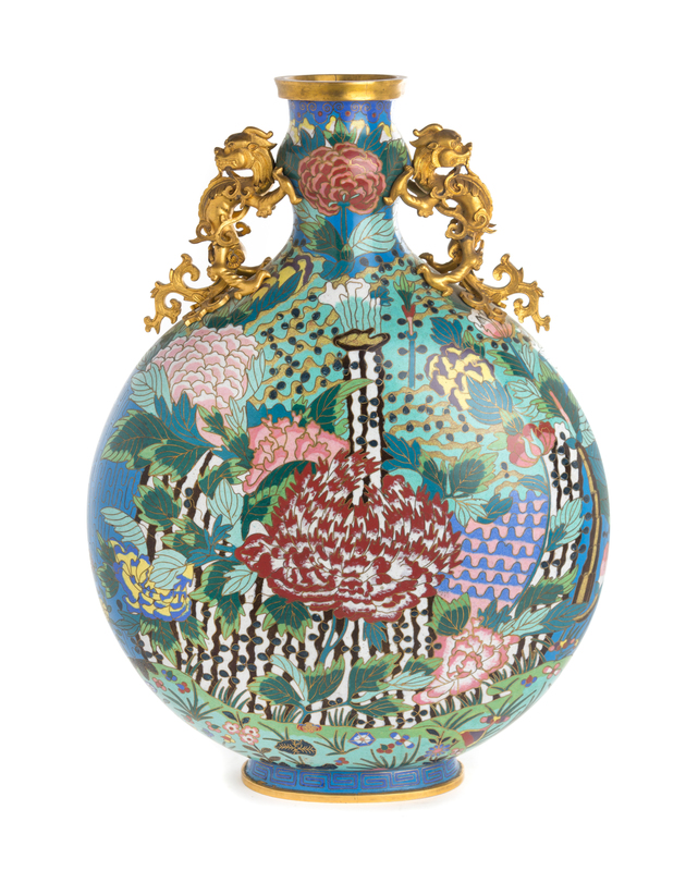 of circular form, decorated with floral blossoms against a blue ground, the neck flanked by a pair of gilt bronze handles in the form of dragons.