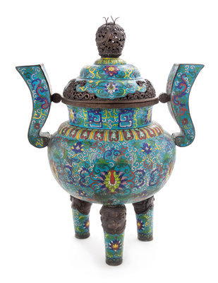 having a globular body raised on three cylindrical legs, the shoulders set with a pair of upright curved handles, decorated with lotus scrolls against a celeste blue ground, the tiered dombed cover surmounted by a bud-form reticulated finial.