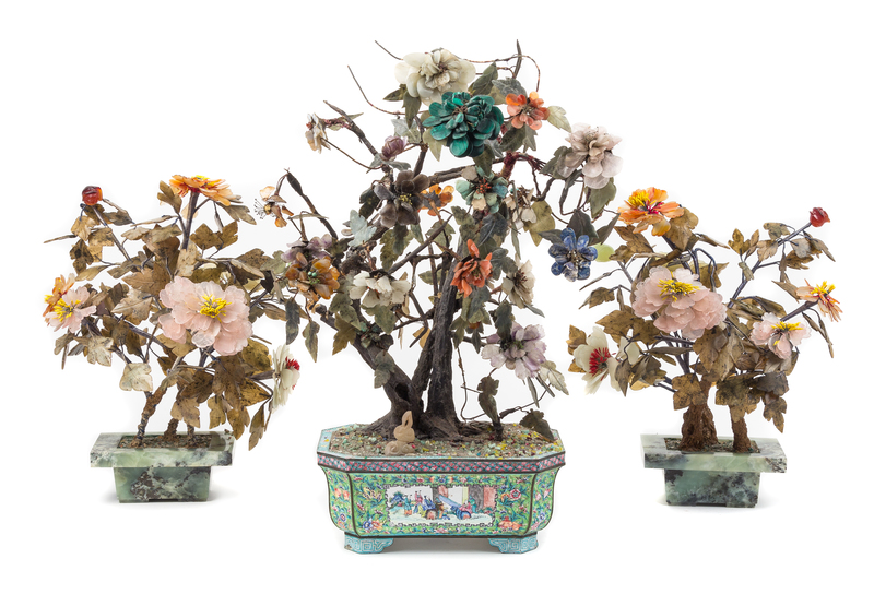 the largest contained in a canton enamel jardiniere painted with figural and landscape panels, the smaller pair contained in pale greenish-white bowenite jardinieres.