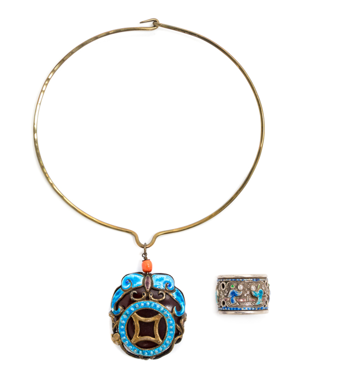 the first a silver chocker necklace suspending a hardstone pendant enclosed by enamel on silver mounting in the form of winged bats above coins; the second an archer's ring, the exterior chased with figures in a garden scene.