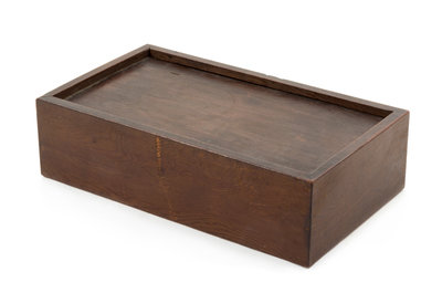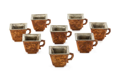 each of square sectioned, carved to the exterior depicting pine trees, lotus and flowering prunus, having a curved handle, all fit in a hardwood box.