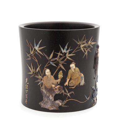 A Hardstone Embellished Zitan Wood Brushpot