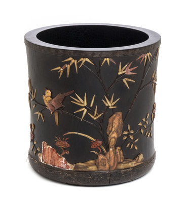 of cylindrical form surmounted by a slightly flared mouth, having inset decoration showing birds perched on bamboo branches and lingzhi sprigs issuing from rockery.
