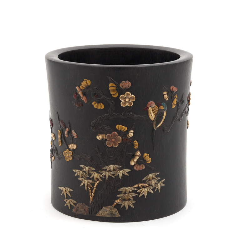 of cylindrical form surmounted by a slightly flared mouth, having inset decoration showing birds perched on bamboo branches and lingzhi sprigs issuing from rockery.