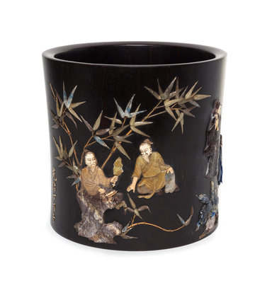 A Large Hardstone Inset Zitan Wood Brushpot