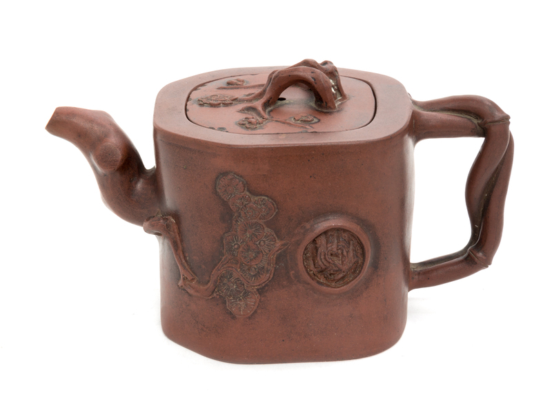 molded in the form of a section of a prunus trunk, carved in relief on one side showing pine tree branches issuing from the spout, the other side with bamboo issuing from the handle, the flat cover decorated with prunus blossoms, the branch forming the knob, the underside bearing a Yu Feng two-character mark with two other characters in Manchu, the interior of the cover incised with a Gong Ju two-character mark.