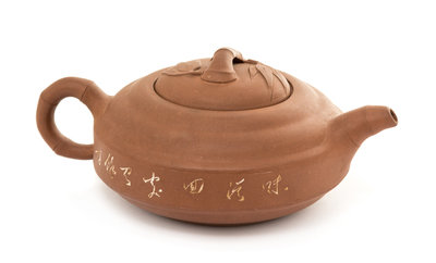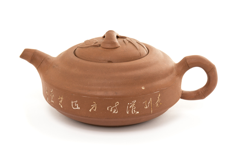 the compressed body decorated with characters, the upright spout and the loop handle molded in bamboo sections, the cover applied with bamboo leaves, the top finial also in the shape of a bamboo section.