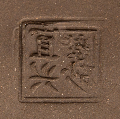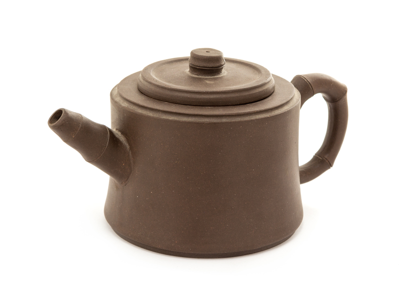 the cylindrical body slightly recessed, the upright spout and the loop handle both in the form of bamboo sections, the underside impressed with a four-character maker's mark within a double square panel.