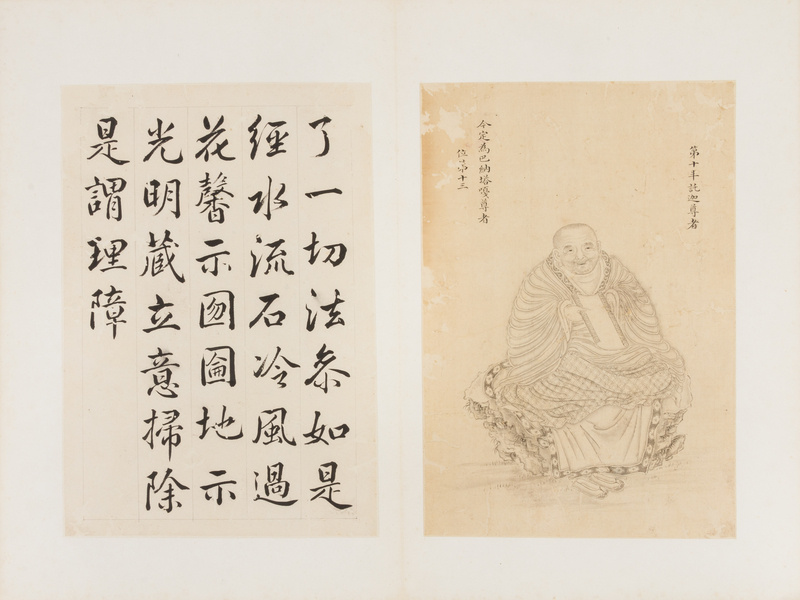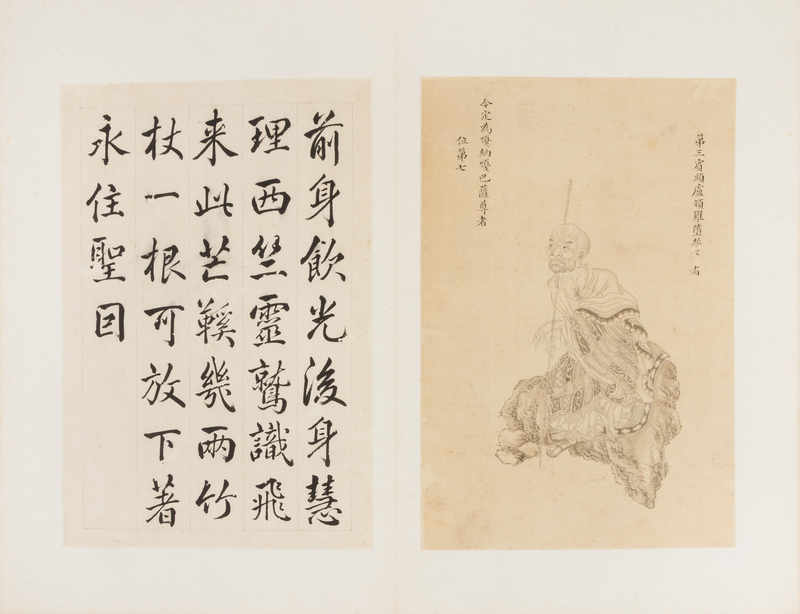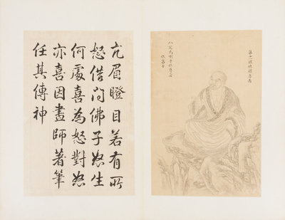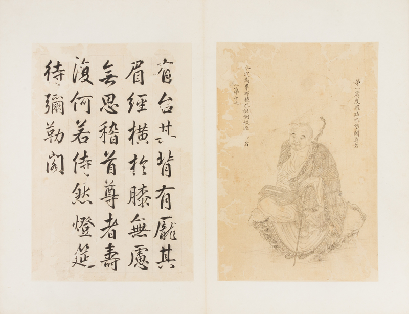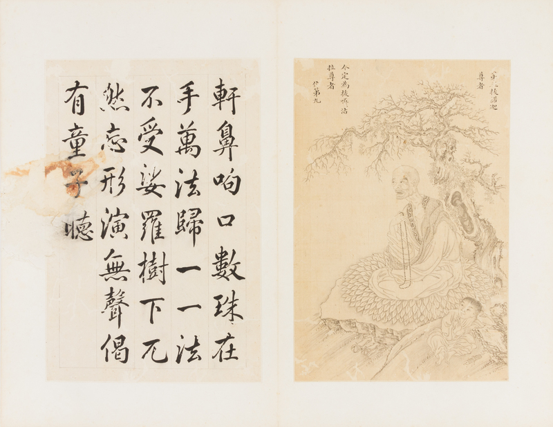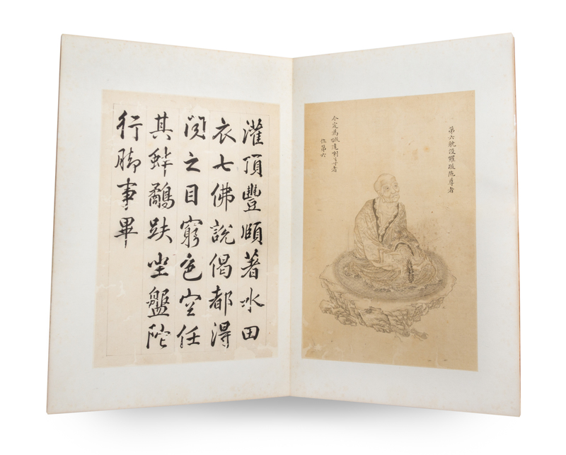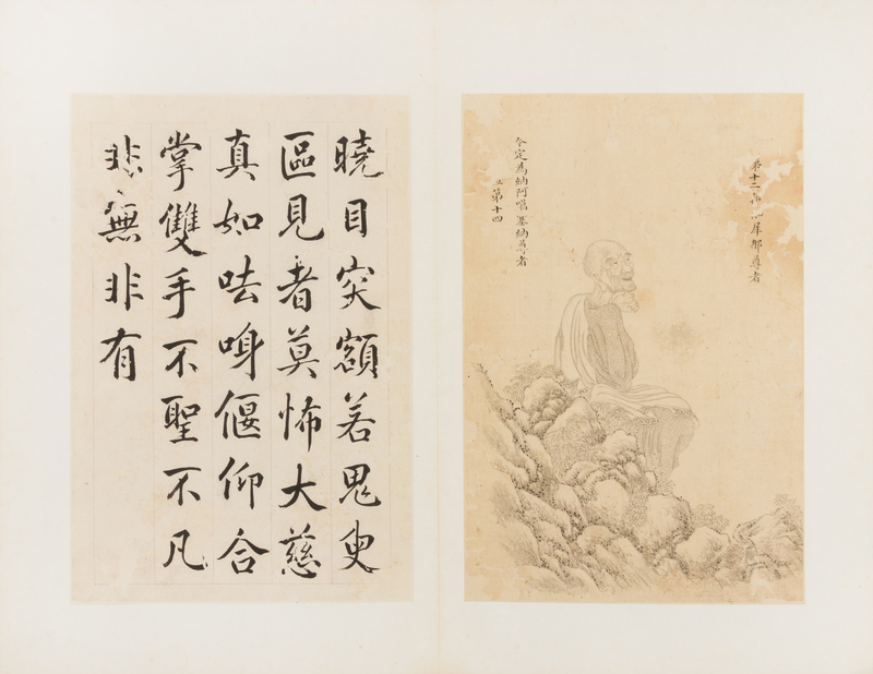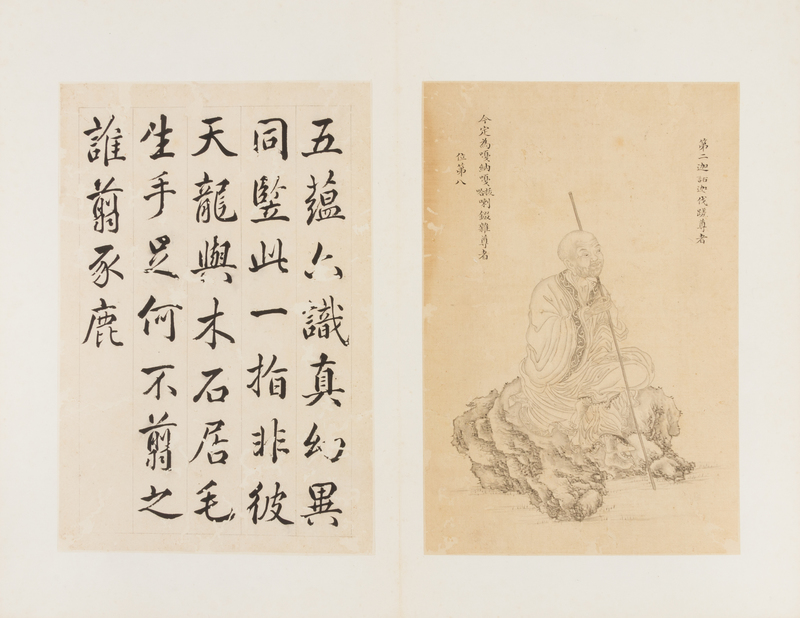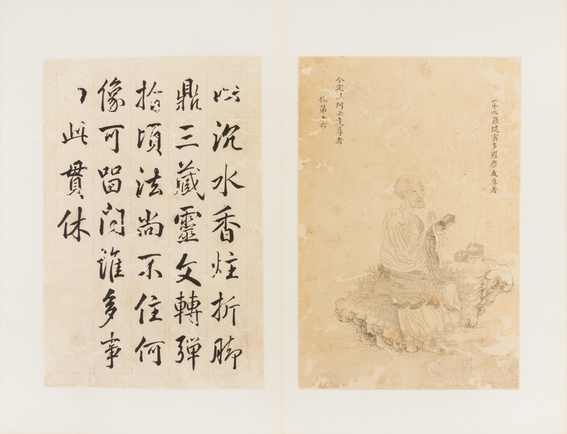 ink and color on silk, depicting the sixteen luohan figures in various pursuits, together with leaves containing annotative texts, colophons by Xu Xin (?-1834), dated March in the tenth year of Daoguang period (1830), followed by inscription by Xu Ruyu with two of his seals Ru, Yu, wood covers.