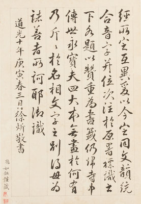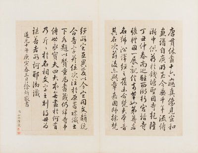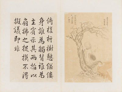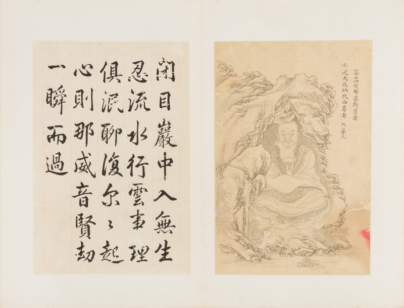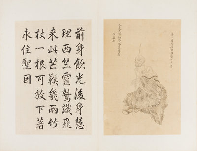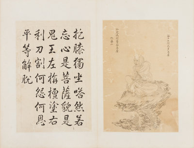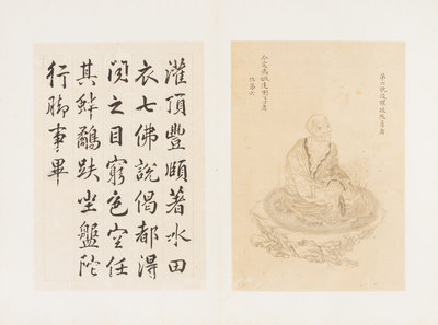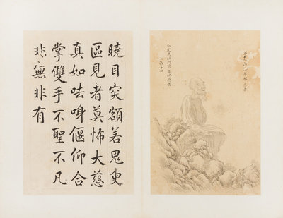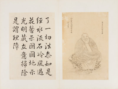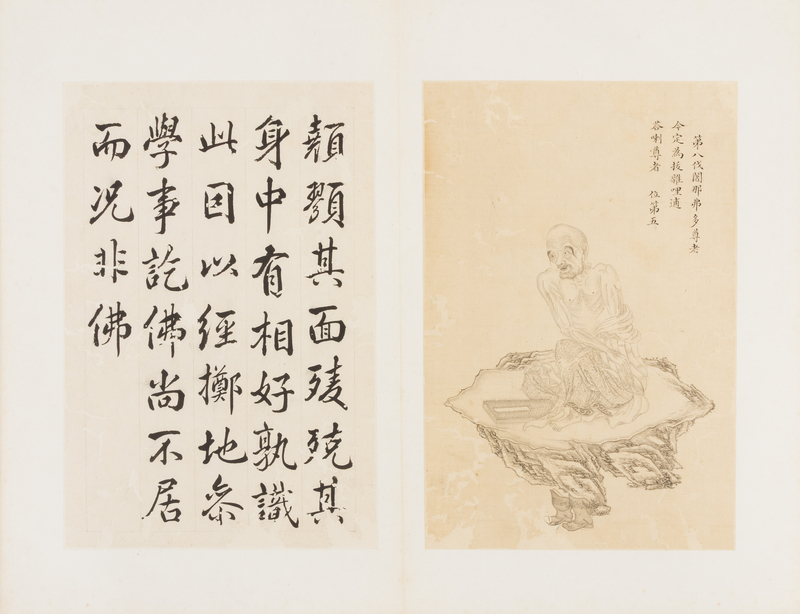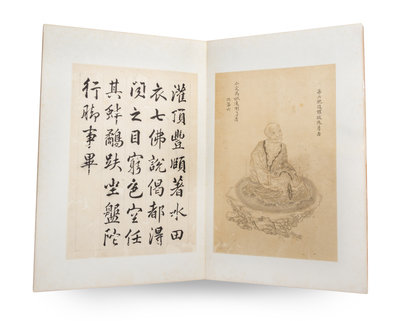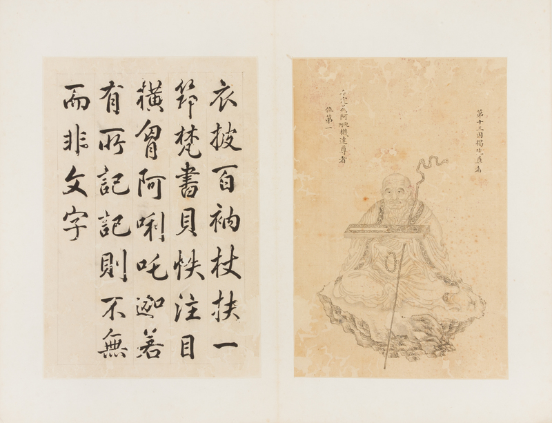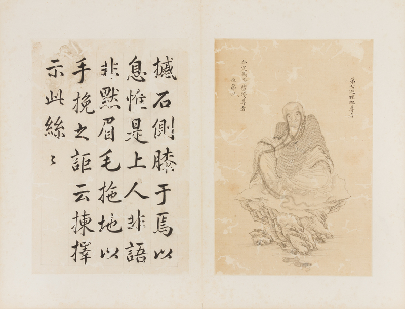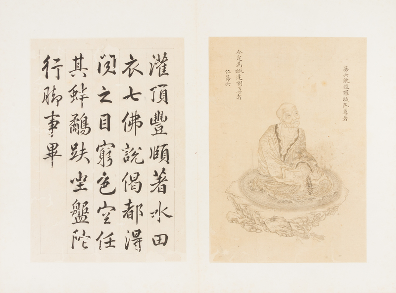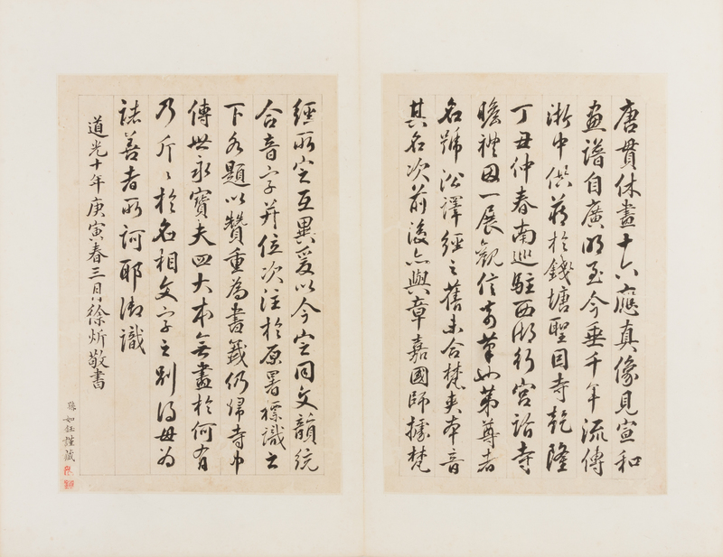 ink and color on silk, depicting the sixteen luohan figures in various pursuits, together with leaves containing annotative texts, colophons by Xu Xin (?-1834), dated March in the tenth year of Daoguang period (1830), followed by inscription by Xu Ruyu with two of his seals Ru, Yu, wood covers.