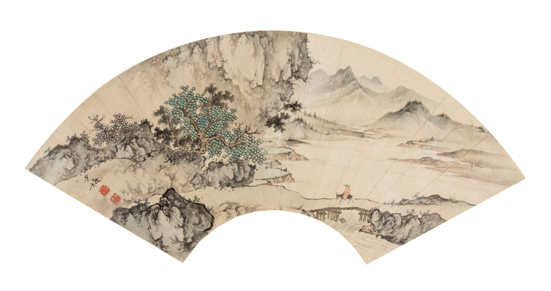 ink and color on paper, fan leaf, framed.