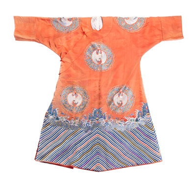 A Chinese Embroidered Silk Salmon-Ground Robe