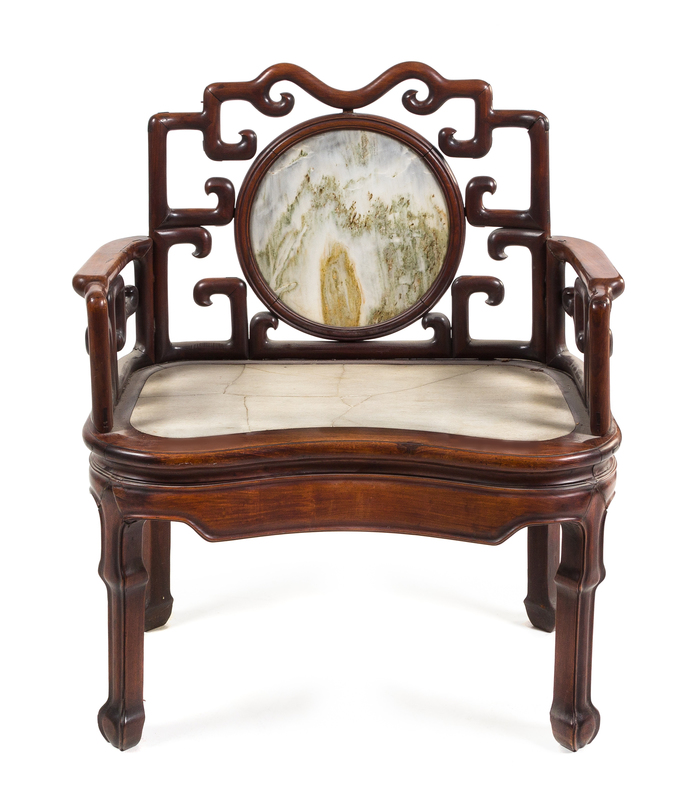 A Chinese Export Dream Stone and Marble Inset Hardwood Armchair