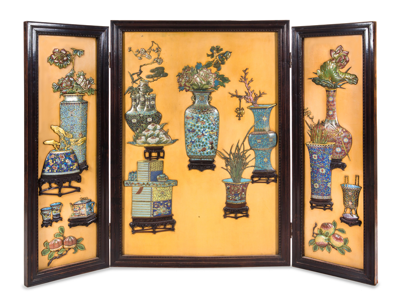 A Chinese Cloisonne Enamel Inset Yellow Lacquered Three-Fold Floor Screen