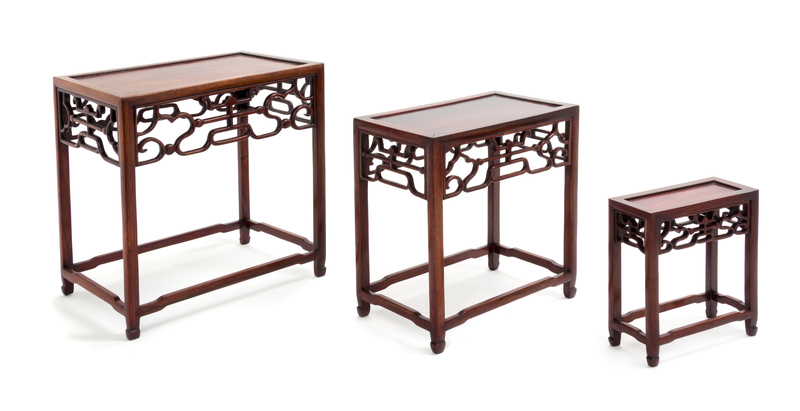 each having a rectangular top panel above reticulated aprons, raised on square sectioned legs joined by a stretcher.