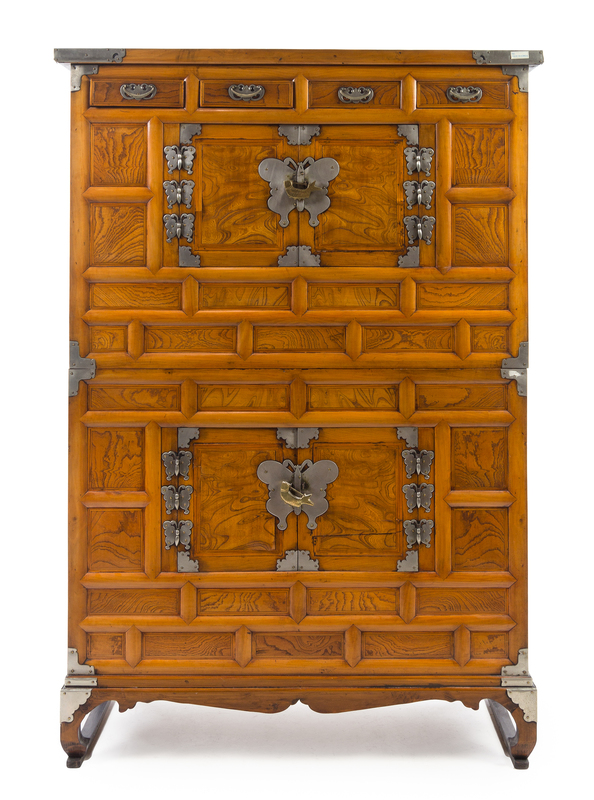 A Korean Metal Mounted Hardwood Two-Section Cabinet