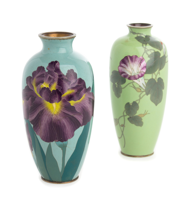 each of slender form with rounded shoulders, worked in silver wire, one decorated with morning glory against a light green ground, siged Hayakawa Komejiro, the other with iris against a mint green ground.