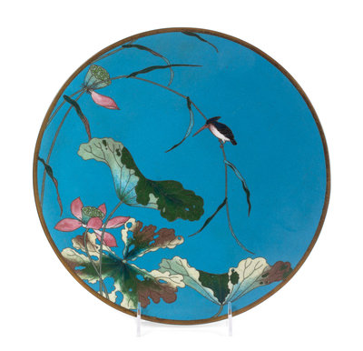 of circular form, depicting a kingfisher perched on a branch above lotus flowers and leaves.