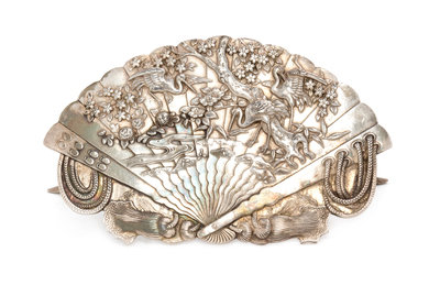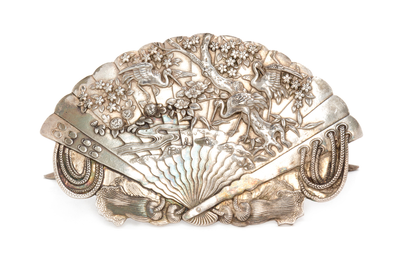 of fan form, the front chased to depict cranes and flowering prunus trees above waves.