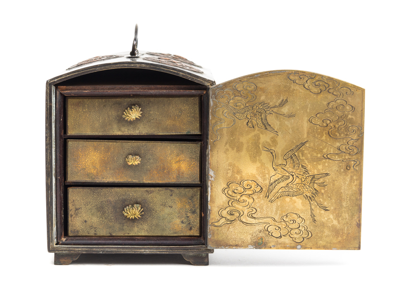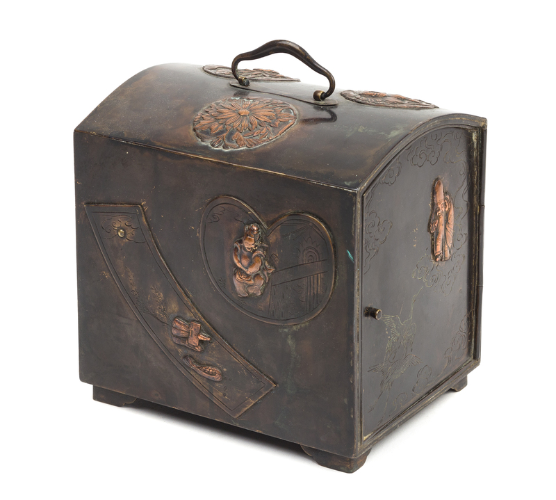 of rectangular form, the sides chased with chrysanthemum panels and resrves enclosing figures, having a a door to one side opening to three drawers.