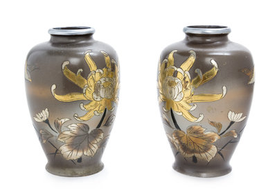 each of baluster form with broad shoulders, decorated with blooming chrysanthemums and birds.