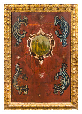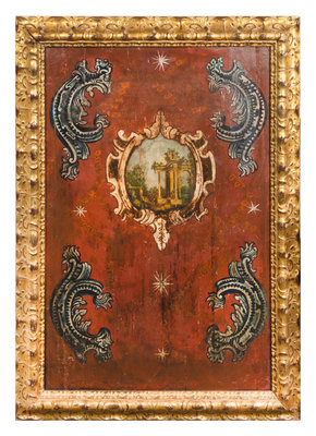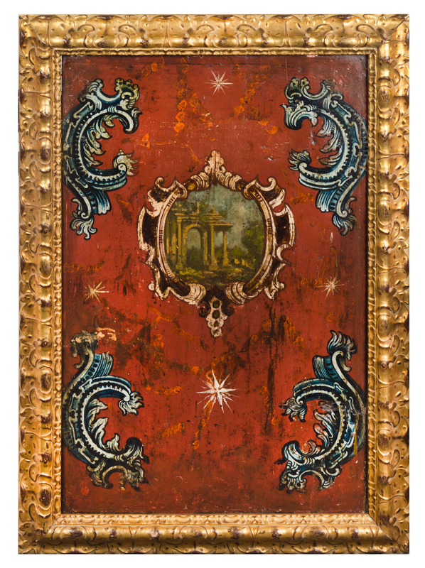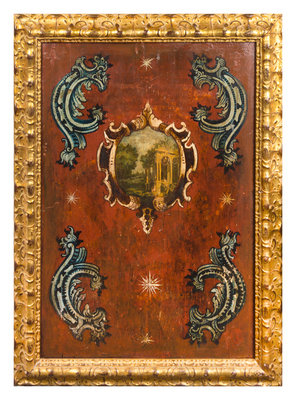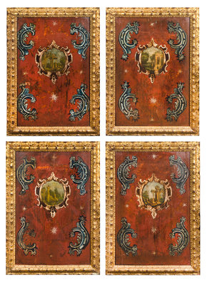 each centered by a cartouche depicting ancient ruins against a rocaille and star decorated ground, set in giltwood frames.