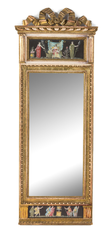 the ribbon tied crest above the verre eglomise frieze panel painted to depict classically draped maidens flanked by Ionic columnar pilasters, the vertical rectangular mirror plate within a frame having egg-and-dart and beaded borders over a verre eglomise panel painted to depict classical figures flanked by fluted pilasters.