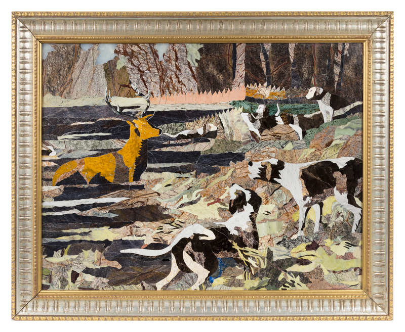 of rectangular form, depicting hunting dogs cornering a stag in a river, framed.
