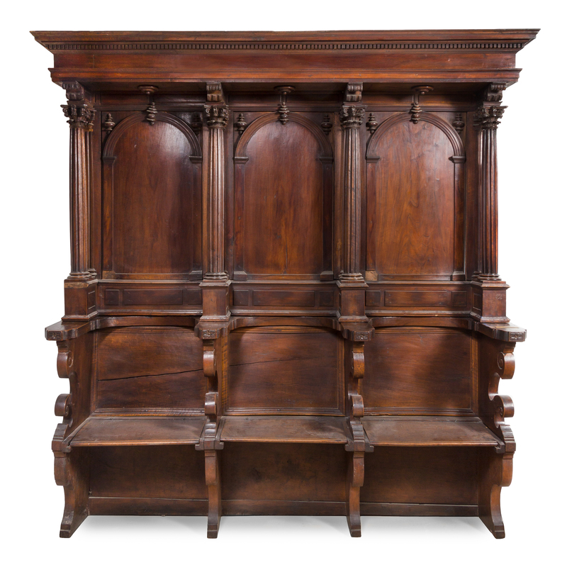 in two parts, the superstructure having an overhanging molded projecting cornice with a dentiled frieze above the paneled back fitted with three architectural niches spaced by fluted Corinthian columns, the base fitted with three seats spaced by shaped brackets.