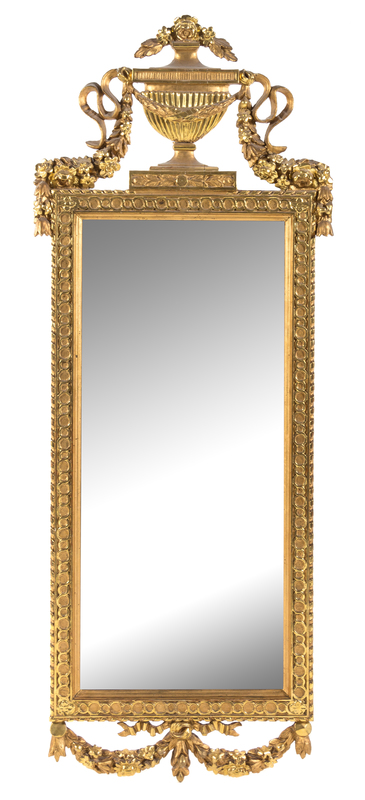 the crest carved to show a flowering urn issuing ribbons and floral swags above the vertical rectangular mirror plate within a frame carved to show running coin decoration, further terminating in ribbon tied floral swags.