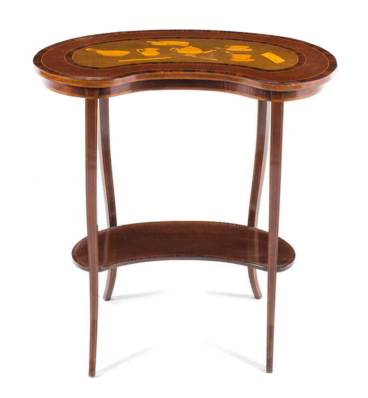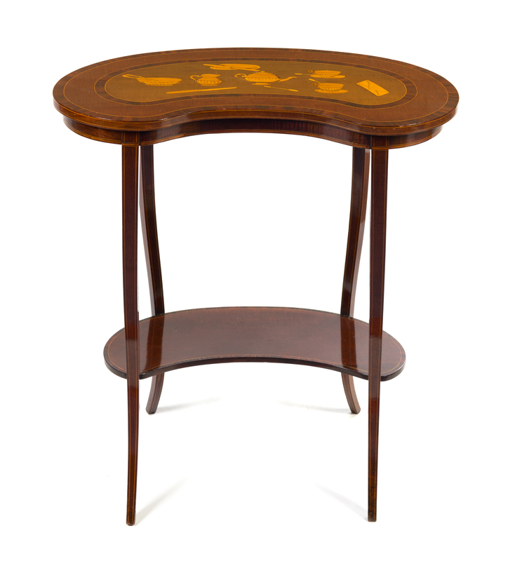 the reniform top inlaid to show various tea articles, raised on square tapering legs joined by a conforming medial shelf.