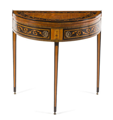 having a demilune top opening to round above the conforming frieze set with two swing-out drawers, raised on square tapering legs.