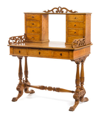 in two parts, the superstructure pierce carved to show foliate C-scrolls above a rectangular top and two banks of four drawers, the base having a rectangular top above three frieze drawers, raised on twin supports in the form of foliate carved cylindrical tapering supports terminating in paw feet.