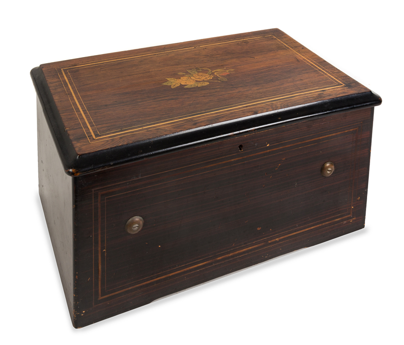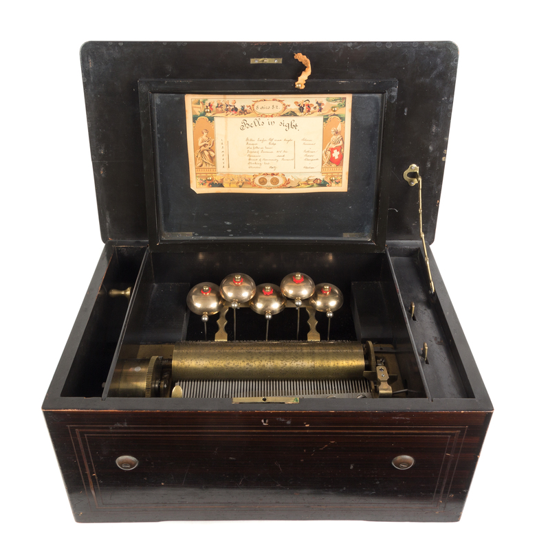 the hinged top inlaid to show a floral spray, playing eight airs on five bells and a nine-inch cylinder.