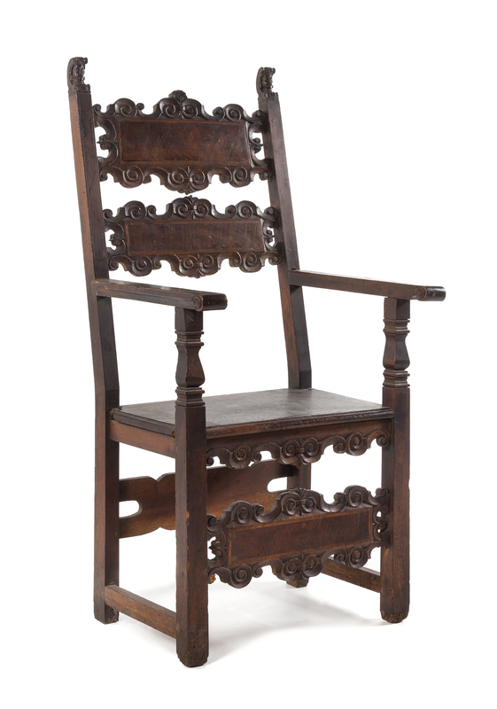 having two female mask finials above two S-scroll carved splats and a rectangular seat within open arms terminating in scroll hand holds, raised on straight legs joined by scroll-carved stretchers.