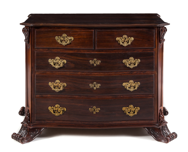 having a rectangular top of serpentine outline with canted corners above the conforming case fitted with two aligned short drawers and three graduated long drawers, raised on foliate carved short legs ending in scrolled toes.