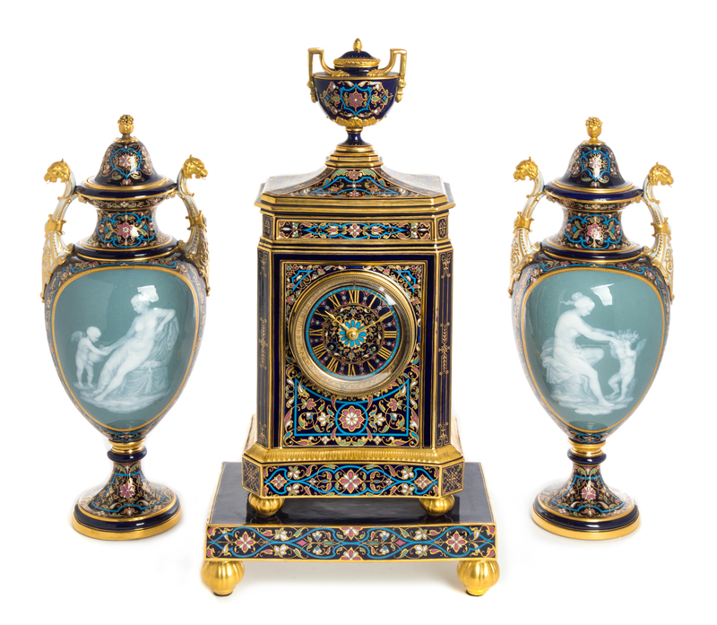 A Meissen Porcelain Pate-sur-Pate Four-Piece Clock Garniture