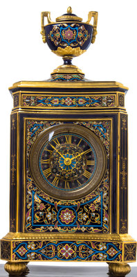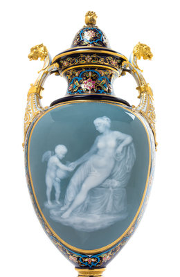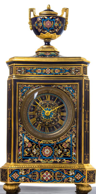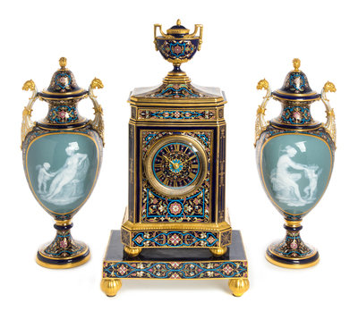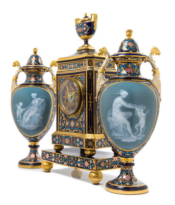 the mantel clock having a handled urn above the case centered with a circular dial with Roman numeral hours, the clock and similarly decorated rectangular base raised on lobed ball feet, together with a pair of covered urns each having a floral bud finial and lion mask handles above the body decorated in white slip to show a classically draped maiden and a cherub, each embellished with an elaborate pattern of foliate scrolls and flowers against a cobalt ground, with crossed swords in underglaze blue and incised numbers to the underside.