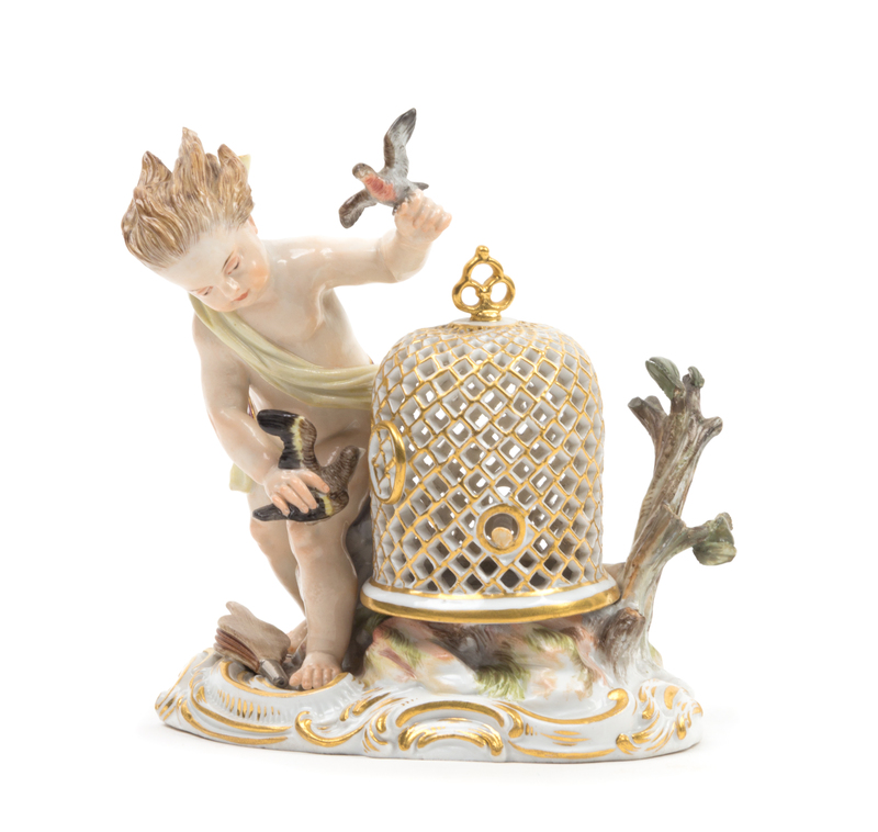 emblematic of Air from a set of The Elements, modeled to show a putto holding two birds next to a bird cage with a set of bellows at his feet, raised on a base with rocaille and C-scrolls, with crossed swords, impressed 10 and incised C99 to the underside.