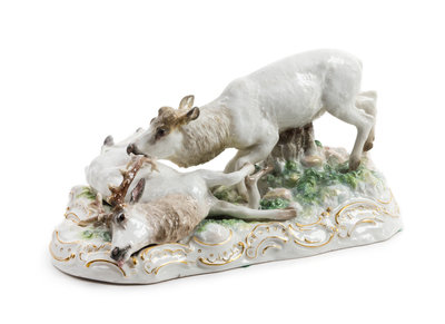 modeled to show battling elk, raised on a naturalistic base with rocaille, having crossed swords in underglaze blue, impressed 83 and incised S173 to the underside.